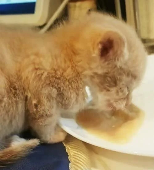 The little ginger baby arrived with her siblings. They were barely 2 weeks old. It seemed like the mother passed away from panleukopenia. Her two siblings shortly developed symptoms and died. I stayed up for three days straight taking 30 minute naps between feeding and medications that needed to happen every 2 hours.